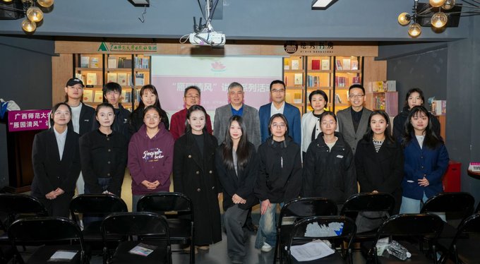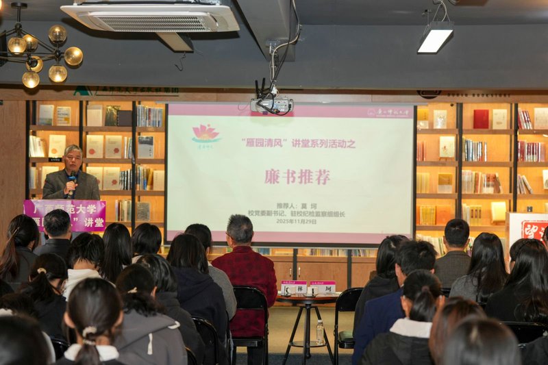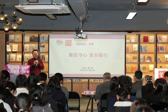 11月29日,党风廉政办联合出版社集团、校团委、研工部、学工部、经济管理学院在雁山校区独秀书房成功举办“雁园清风”讲堂系列活动。校党委副书记、驻校纪检监察组组长莫坷,文学院/新闻与传播学院教师陈广林等领导嘉宾,相关部门负责人与第四届校园廉洁大使、各学生社团代表70余人齐聚一堂,在系列活动中感悟廉洁真谛。